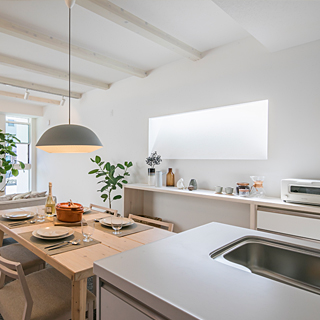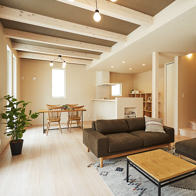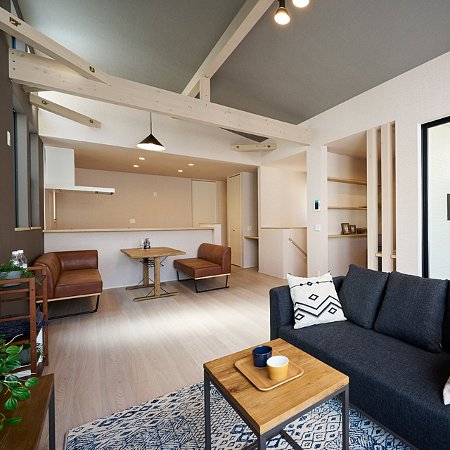 構造部分の梁を内装に現すことで、高さ2.7mの天井高を実現するとともに、木の質感が印象的な空間を演出します。