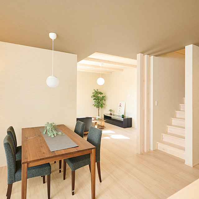 上下の空間をつなげる吹抜けは開放感と光の演出による広がりをもたらします。家族のコミュニケーションにも最適。