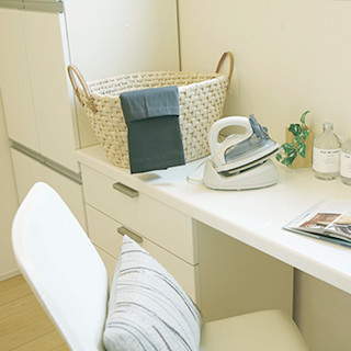 キッチンからの家事動線に設置された奥さまの万能スペース。パソコンや読書、アイロンがけなどの作業を愉しみながらできます。