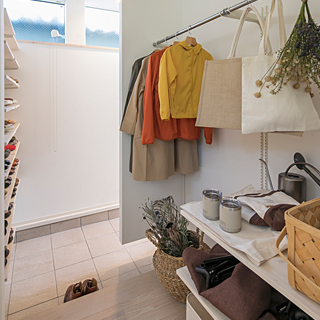 靴やコート、ベビーカー、ゴルフバッグ、掃除道具などをしまえる大型収納。玄関を美しく保ち、生活感をなくすことができます。