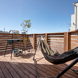 居室とつながるウッドデッキは、光と風が抜ける快適な大空間。ホームパーティやお子さまの遊び場などにも愉しめる設計です。