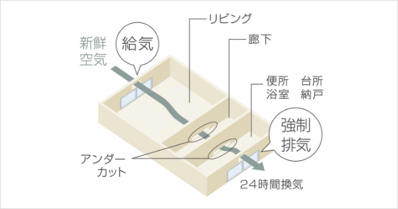 給気と排気をバランスよく行い、快適な室内空間をつくる換気設備。各居室はもちろん、洗面室やトイレの換気も万全です。