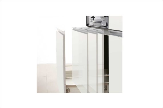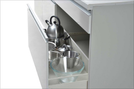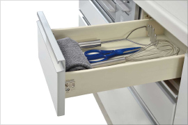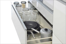 引き出しが閉まる直前にスピードが落ちて、ゆっくりしまるスローインクローズを搭載。静かで安心なレールです。(耐荷重15kg)※①スパイスボックスは除く。